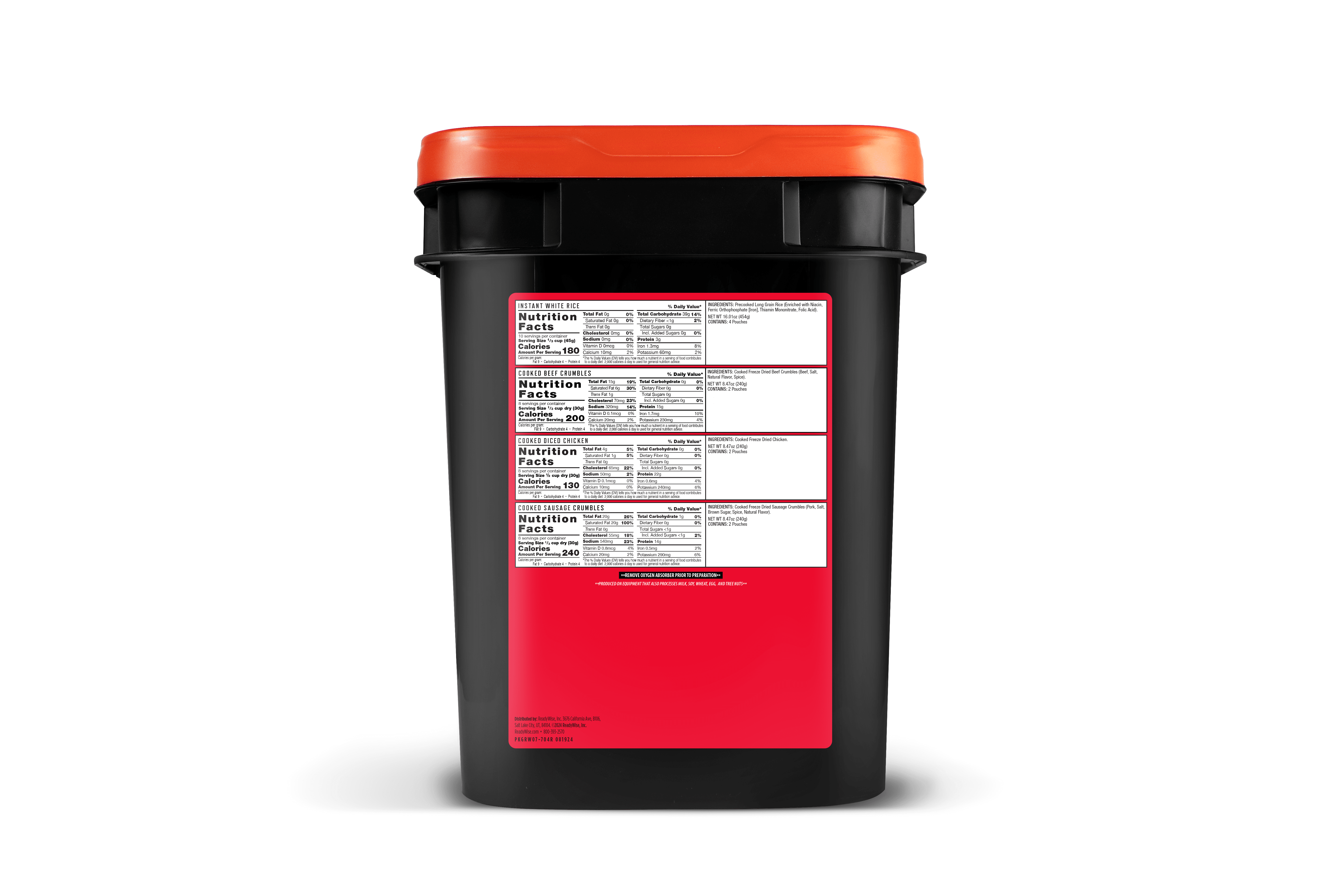 Contents 40 Servings Instant White Rice – 4 10/Serving pouches 16 Servings Beef Crumbles – 2 8/Serving pouches, 240g total 16 Servings Diced Chicken – 2 8/Serving pouches, 240g total 16 Servings Sausage Crumbles – 2 8/Serving pouches, 240g total